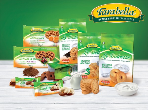 senza glutine e della gustosa linea dolce che comprende biscotti per la prima colazione, merendine e snack perfetti per ogni pausa dolce. La dolcezza si combina con la leggerezza degli ingredienti scelti, incontrando così il gusto, le preferenze e le necessità di ogni persona. Un assortimento pensato per la prima colazione che comincia con teneri e gustosi biscotti nel formato classico, si estende a più friabili biscotti frollini senza uova, per arrivare a leggeri biscotti allo yogurt, senza zucchero. Anche la merenda ha il sapore di leggerezza con la proposta di crostatine a base di confettura di albicocca o frutti di bosco. Farabella pensa anche a quei momenti della giornata in cui si fa sentire il richiamo alla pausa dolce proponendo degli snack gluten-free in pratiche confezioni monodose.